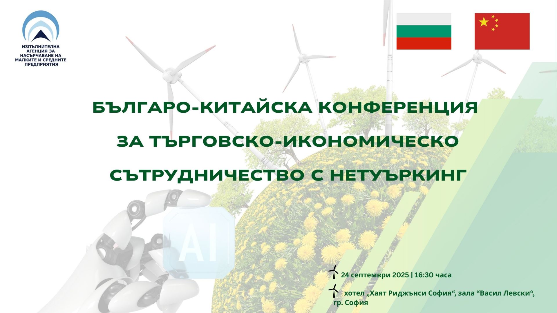 Изпълнителната агенция за насърчаване на малките и средните предприятия (ИАНМСП), съвместно Китайското посолство в България, организират Българo-китайска конференция за търговско-икономическо сътрудничество, която ще се проведе на 24.09.2025 г. в гр. София, хотел „Хаят Риджънси София“. Събитието се организира в рамките на посещението на г-н Ли Джундзюн, вицегубернатор на провинция Дзянсу, който ще бъде придружен от бизнес делегация от Китай. В делегацията ще се включат представители от следните сектори - научноизследователска и развойна дейност, роботика, изкуствен интелект, зелена енергия, енергийни системи, интелигентни фотоволтаични системи, аутомотив и електрически превозни средства и др.
