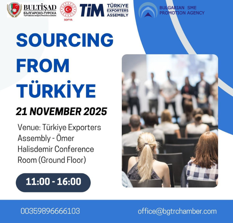 Изпълнителната агенция за насърчаване на малките и средните предприятия (ИАНМСП) към Министерството на иновациите и растежа има удоволствието да покани представители на българския бизнес да вземат участие в Международната конференция „Sourcing from Türkiye” („Доставки от Турция”), която ще се проведе на 21 ноември 2025 г. в Истанбул, Турция.