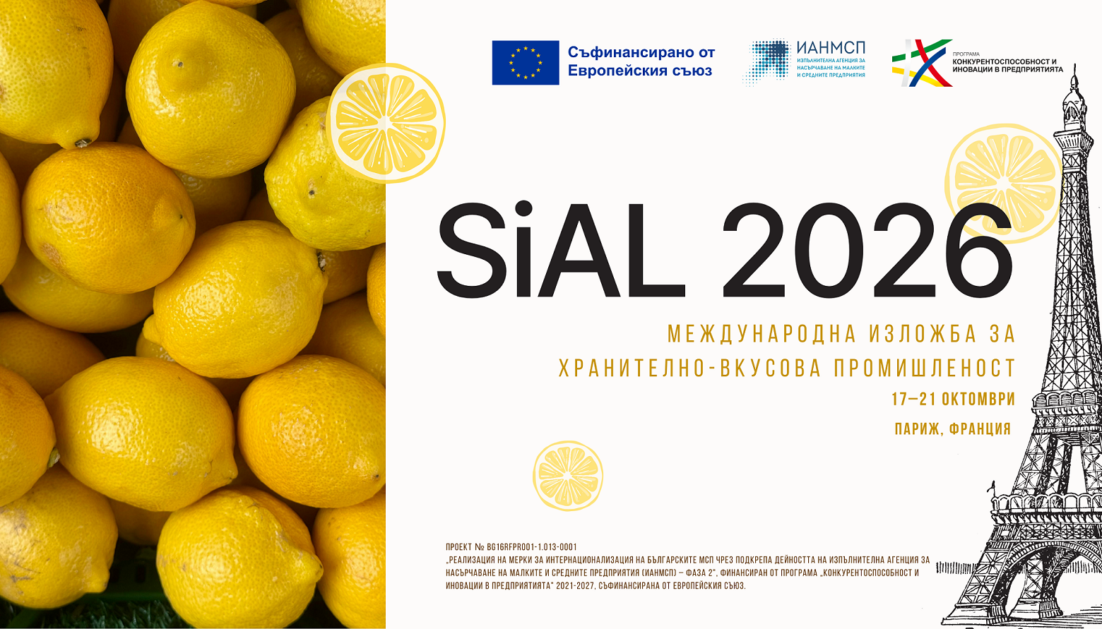 Участието на малки и средни предприятия (МСП) на SIAL Paris 2026 се организира и финансира със средства по Проект № BG16RFPR001-1.013-0001 „Реализация на мерки за интернационализация на българските МСП чрез подкрепа дейността на Изпълнителна агенция за насърчаване на малките и средните предприятия (ИАНМСП) – Фаза 2“, финансиран от Програма „Конкурентоспособност и иновации в предприятията“ 2021-2027, съфинансирана от Европейския съюз.