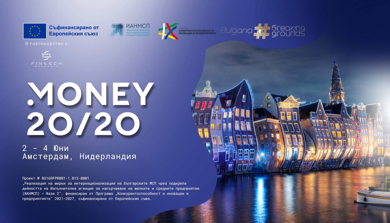 Изпълнителната агенция за насърчаване на малките и средните предприятия (ИАНМСП) организира участие с институционален щанд на Международната конференция за финансови технологии, дигитални плащания и иновации във финансовия сектор Money20/20 Europe 2026, което ще се проведе в периода 02–04.06.2026 г. в гр. Амстердам, Нидерландия. Събитието се организира в изпълнение на Дейност 5 по Проект № BG16RFPR001-1.013-0001 „Реализация на мерки за интернационализация на българските МСП чрез подкрепа дейността на Изпълнителна агенция за насърчаване на малките и средните предприятия (ИАНМСП) – Фаза 2“, финансиран от ПКИП 2021–2027.