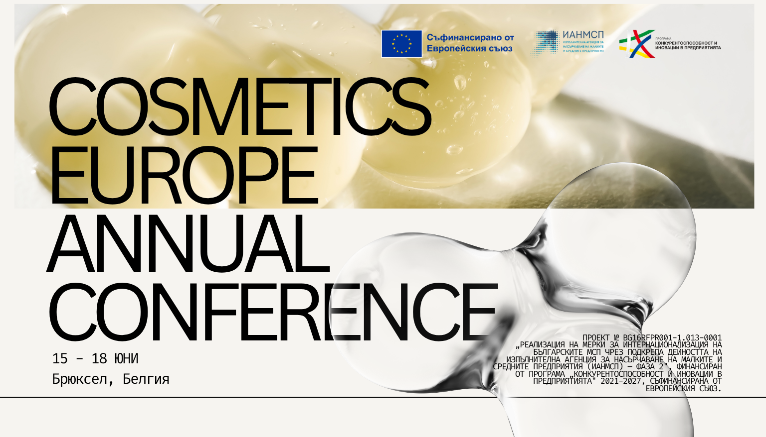 В изпълнение на Проект № BG16RFPR001-1.013-0001 „Реализация на мерки за интернационализация на българските МСП чрез подкрепа дейността на Изпълнителна агенция за насърчаване на малките и средните предприятия (ИАНМСП) – Фаза 2“, финансиран от Програма „Конкурентоспособност и иновации в предприятията“ 2021-2027, съфинансирана от Европейския съюз, Изпълнителната агенция за насърчаване на малките и средните предприятия (ИАНМСП) организира Търговска мисия, с участие в международна конференция за козметика, парфюмерия и етерични масла Cosmetics Europe Annual Conference (CEAC) 2026, 15-18.06.2026 г., гр. Брюксел, Белгия. Поканени за участие в търговската мисия са български малки и средни предприятия, производители на етерични масла, козметика и парфюмерия, които развиват икономическа дейност в секторната насоченост на търговската мисия и са част от националните и регионалните приоритетни сектори, съгласно Националната стратегия за малките и средни предприятия 2021-2027 г. (НСМСП 2021-2027), посочени в приложение №2 от Правилата за организиране, провеждане и участие на български производители в търговски мисии в чужбина, организирани от ИАНМСП.